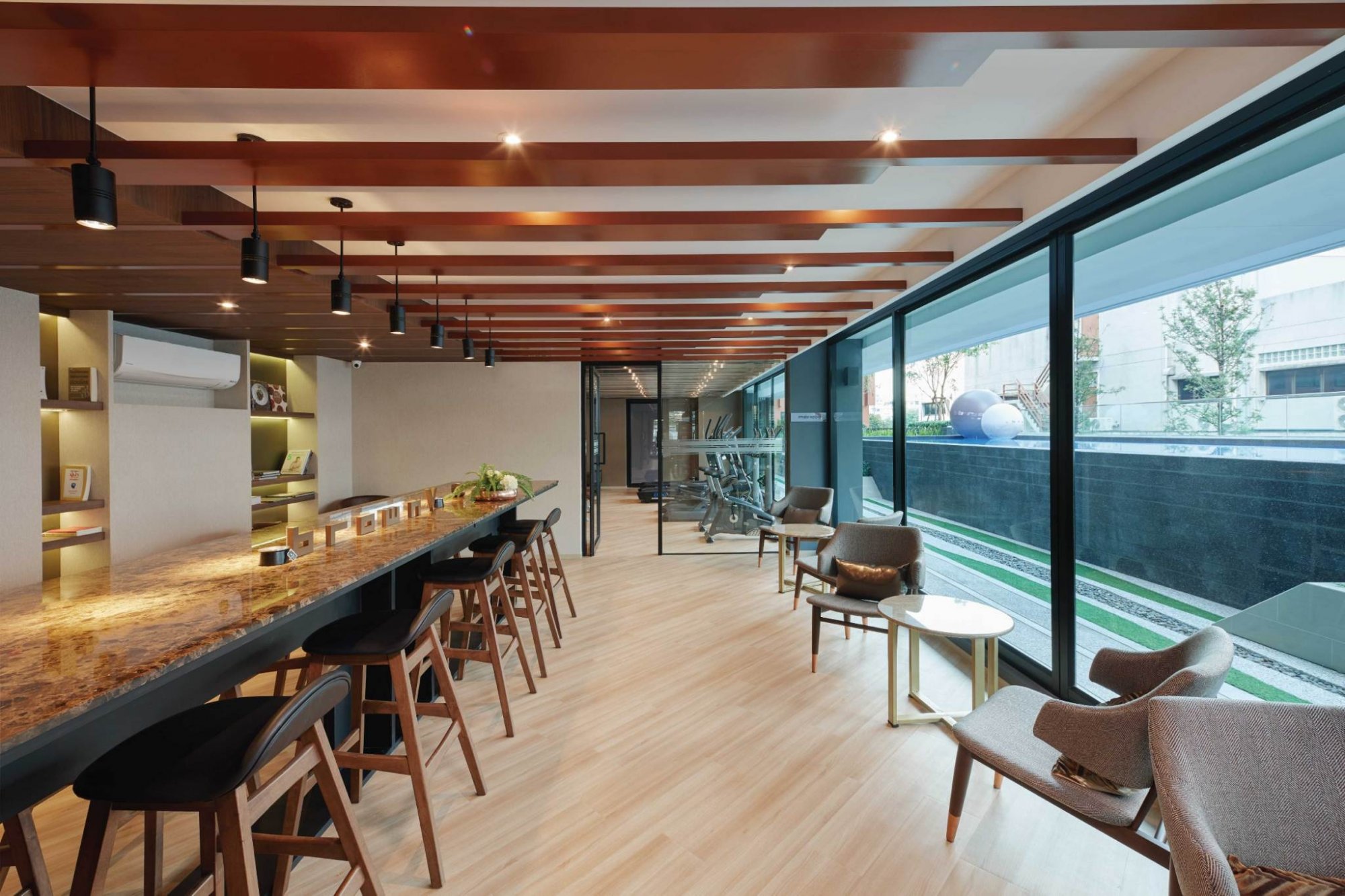 เมื่อเราผ่านประตูจากโซน Lobby มาแล้วนะคะ ห้องแรกที่เราจะพบคือในส่วนของ Library Lounge นั่นเองค่ะ ซึ่งห้องนี้สามารถใช้เป็นห้องทำงาน หรือห้องนั่งพักผ่อนอ่านหนังสือได้ชิลๆเลยค่ะ เนื่องจากการตกแต่งภายในนั้นเน้นให้ดูอบอุ่น และธรรมชาติ ผนังด้านหน้าจะเป็นกระจกแบบ Full Height ทั้งหมดสามารถรับชมวิวในส่วนของสระว่ายน้ำได้อีกด้วยค่ะ