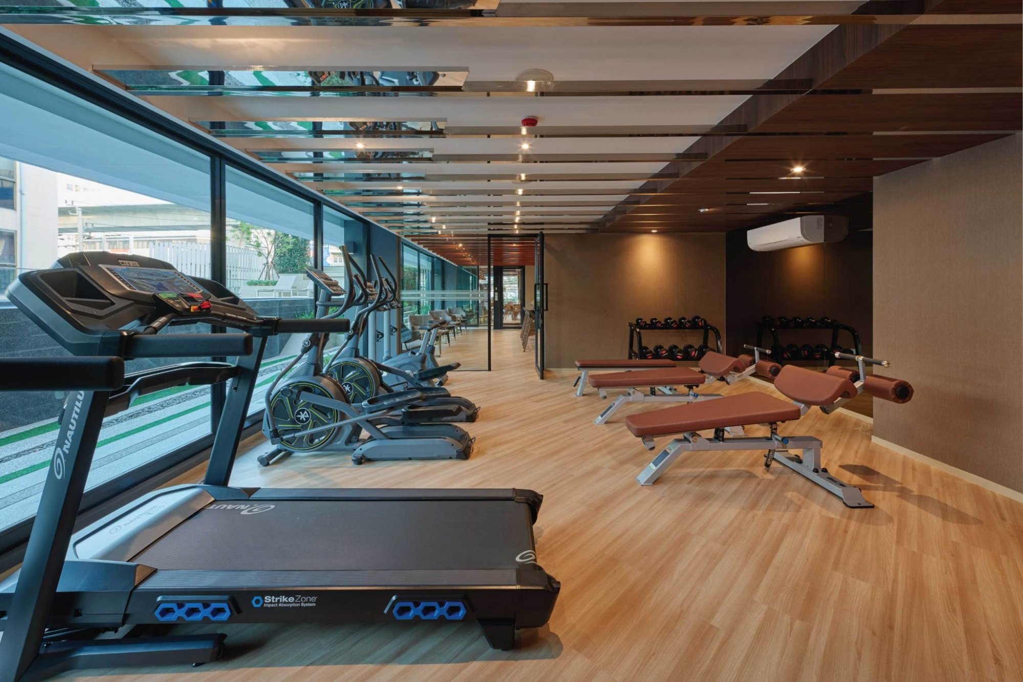 จากห้องฟิตเนสนั้นเราสามารถเห็นวิวสระว่ายน้ำได้ที่โซนของ Cadio ค่ะ ซึ่งจะมีลู่วิ่งไฟฟ้า, เครื่องนั่งปั่นจักรยาน สามารถออกกำลังกายไป ชมวิวด้านนอกไปด้วยได้แบบสบายใจ หายเหนื่อยเลยค่ะ